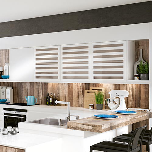 Poudari svojo kuhinjo s premium steklenimi omaricami DANKÜCHEN. Vrtljive ali dvižne omare pritegnejo pogled v beli, modni barvi Cerros, Anthrazit ali Schiefer ter fascinirajo s svojo funkcionalnostjo in optiko. Zraven izberite prav tako ujemajočo se osvetljavo DANKÜCHEN, ter uživajte v premium ambientu z vašimi najdražjimi tudi v večernih urah.
