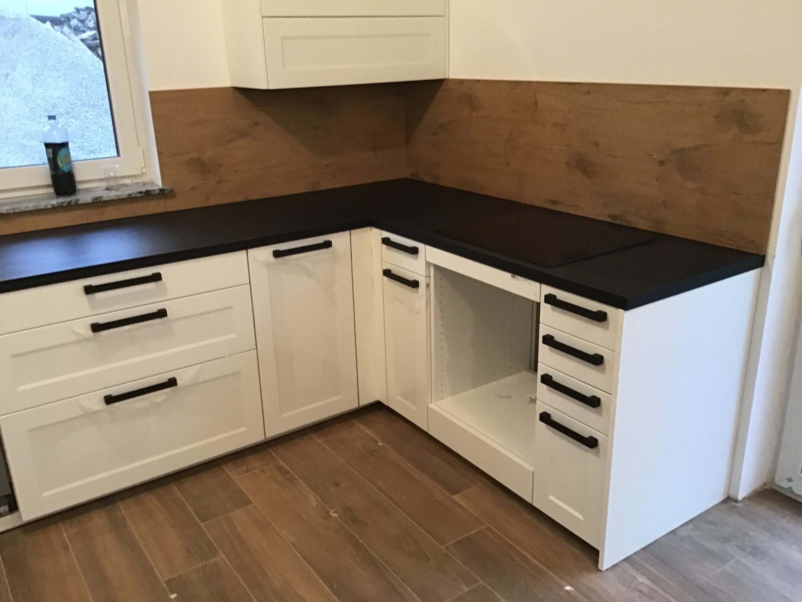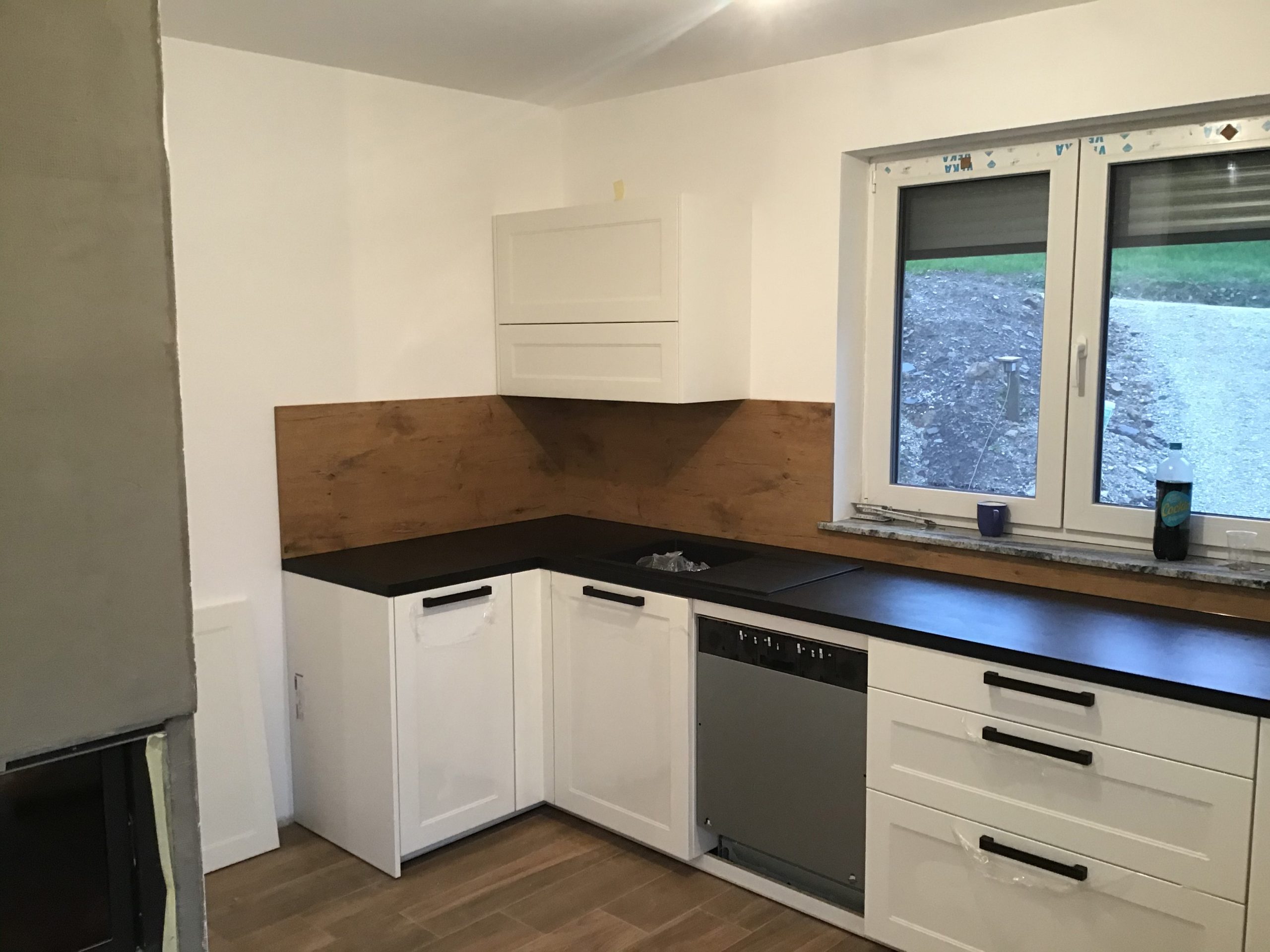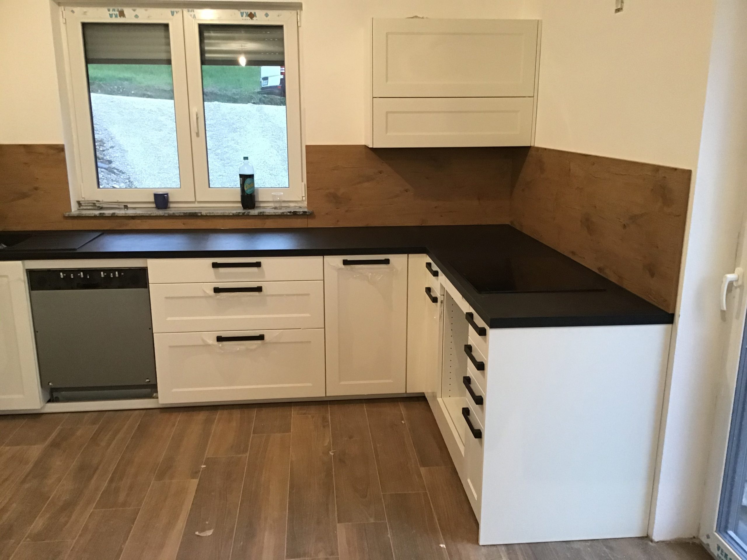 Izbrana kuhinja je v beli mat barvi Polarweiß in z delovno ploščo v temnem odtenku Coro ter temnimi ročaji, ki kuhinji dvignejo estetsko vrednost. S stensko oblogo v barvi Burguesa Eiche je stranka v kuhinjo vnesla košček narave, ki jo lahko med pripravo hrane skozi veliko okno tudi opazuje.