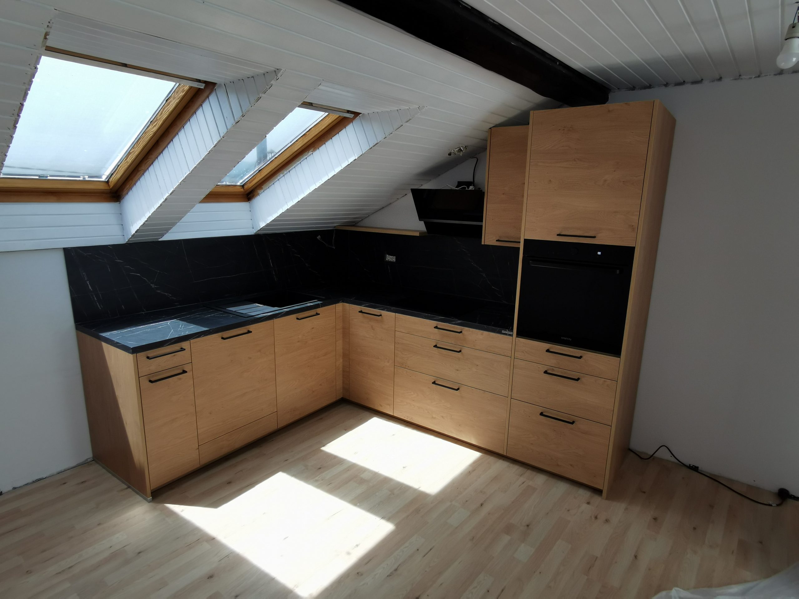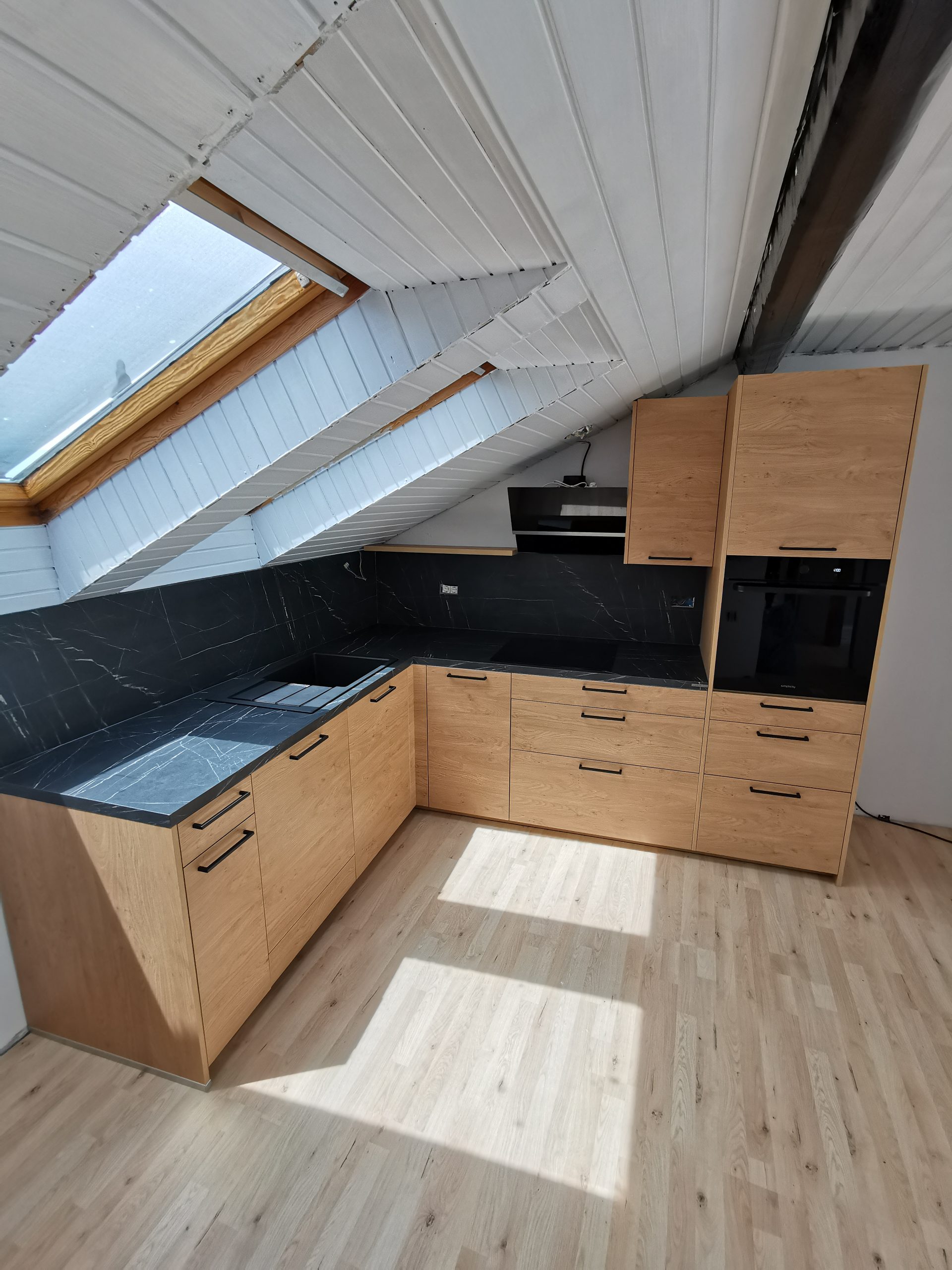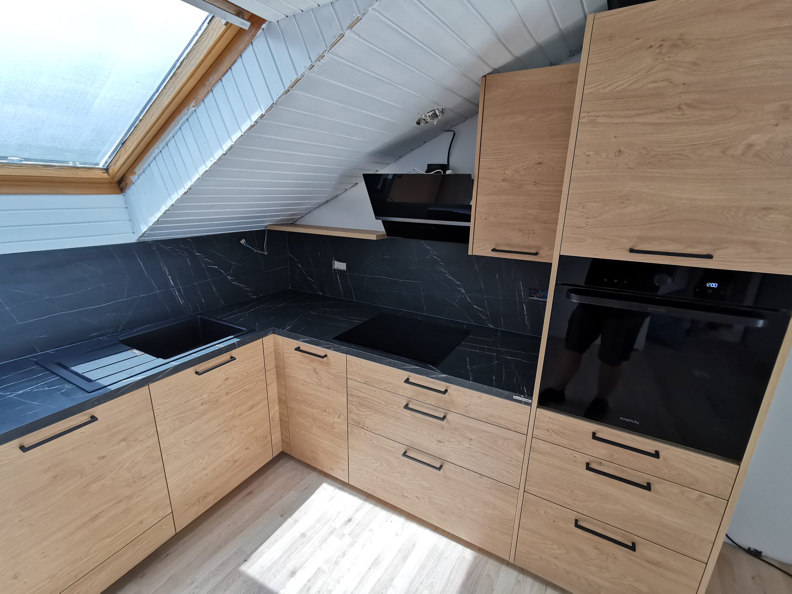 Stranka je želela kuhinjo, ki se bo do milimetra natančno prilegala mansardnemu prostoru. Obrnila se je na nas, zato smo ji uresničili željo z moderno kuhinjo La Corte. Fronte so v lesnem odtenku Ulme, delovna plošča in stenska obloga pa v temnem odtenku Quarz.